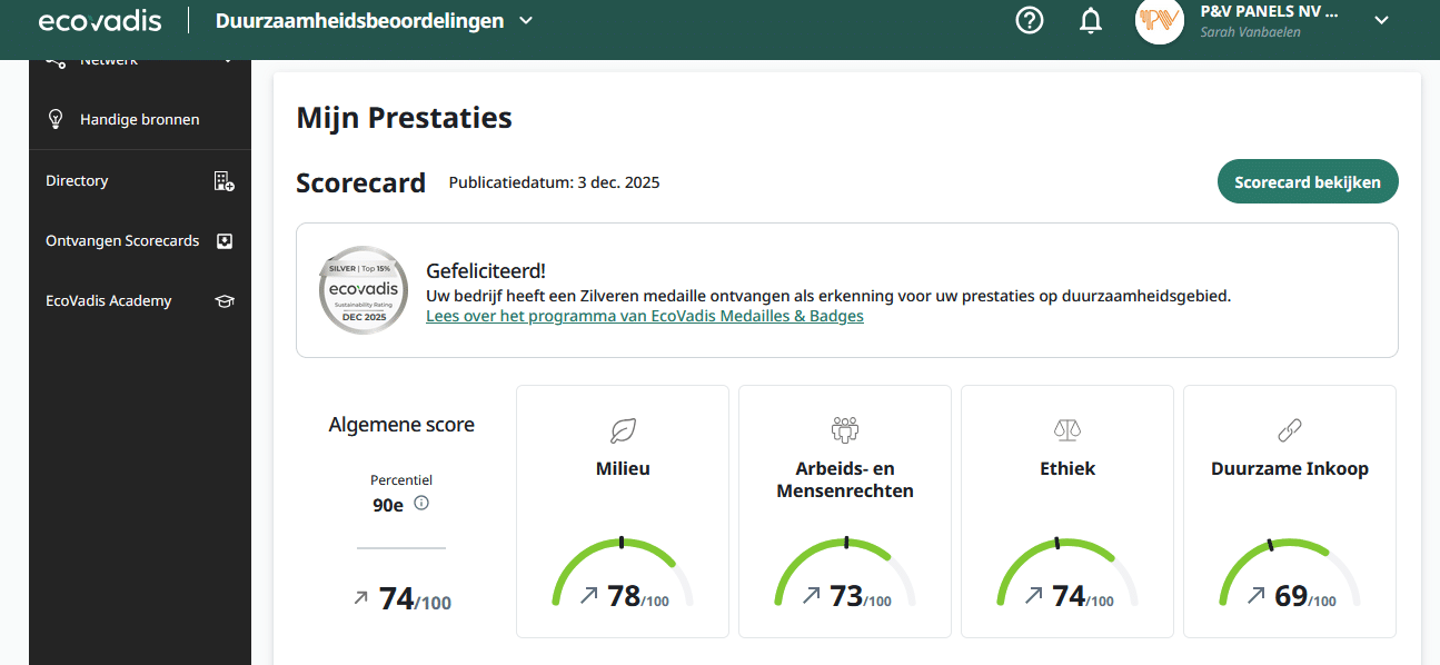 P&V Panels heeft recent een zilveren medaille behaald in de duurzaamheidsbeoordeling van EcoVadis. Met een totale score van 74/100 (scorecard gepubliceerd op 3 december 2025) bevinden we ons in het 90e percentiel — ofwel bij de beste 15% van de beoordeelde bedrijven. De zilveren medaille bevestigt dat onze aanpak rond ESG-thema’s inhoudelijk sterk staat én dat we aantoonbaar stappen zetten.